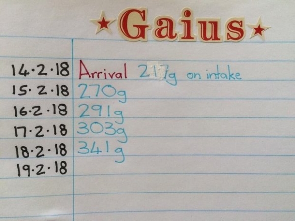 暖心的照顧員都有詳細記錄牠的體重~四天他就重了124克~