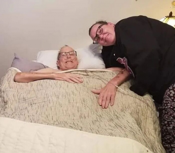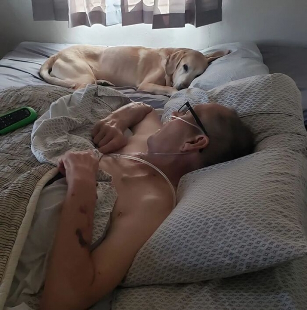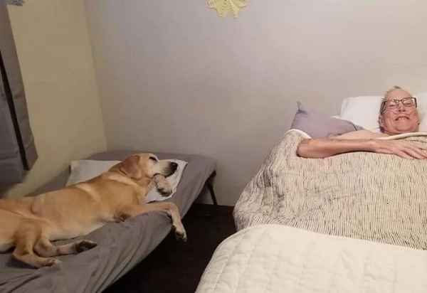 出於人道的考慮,醫院同意了這個申請,護士在Daniel的病床旁邊,搭了一張小床,女兒隨後就把Gunner帶進了老爸的病房。 Daniel看到狗狗後,心情一下子晴朗了很多……