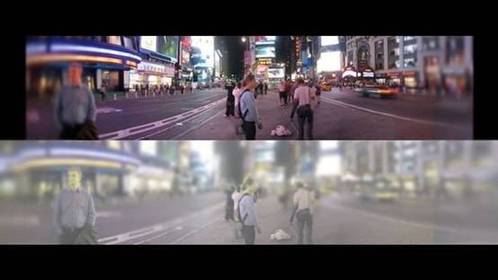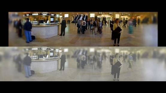 貓更擅長捕捉運動中的物體,圖中右側一個行走中的婦女,在人眼中一片模糊,而在貓眼中卻顯得很清晰▼