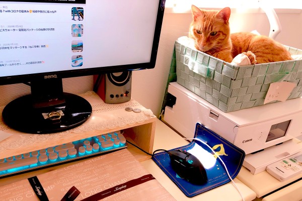 推主@ichigopants48由於新型冠狀病毒(COVID-19)疫情的關係已經在家工作一段時間,這期間推主的橘貓「Kinako」似乎不太習慣主人整天都在家,頻頻上前引起注意干擾推主工作,一下踏過電腦鍵盤「幫忙打字」,一下要人幫牠摸摸或拍拍,因此推主只好在電腦旁的印表機上放置籃子讓牠窩在裡面。