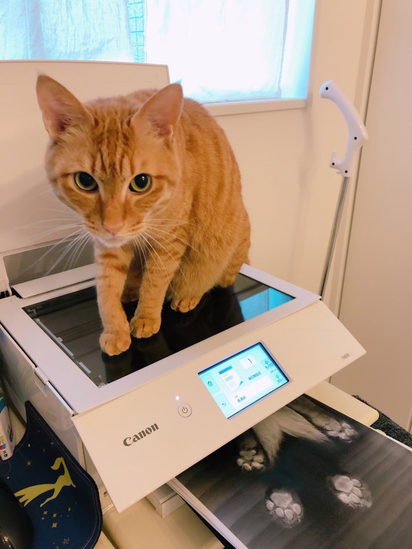 推主的橘貓「Kinako」很喜歡佔據印表機的位置,隨時干擾主人工作