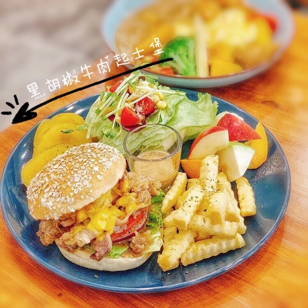 ▼爆漿的牛肉起司堡~搭配沙拉跟水果!讓人超滿足的一個拼盤!!(必點)