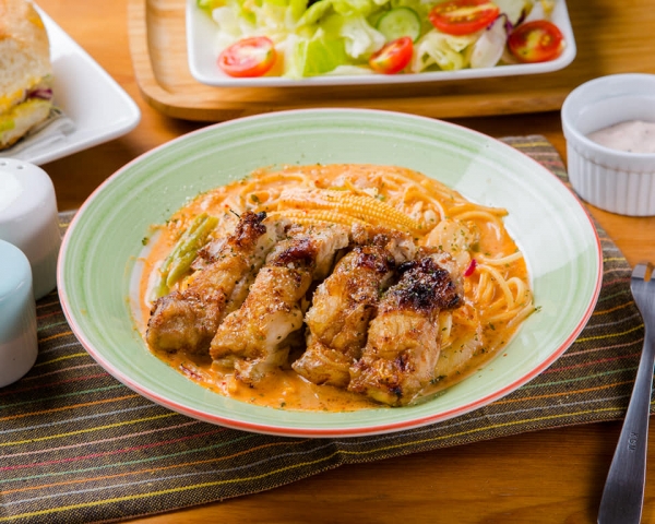 ▼蜜汁烤雞腿義大利麵 ~新鮮的玉米筍搭配香嫩多汁的雞肉,香料一個下去超香der~(已流口水)