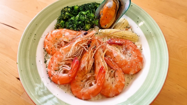 ▼白醬義大利麵上鋪滿滿的蝦子在撒上細細綿綿的起司粉,還不吃爆!!!