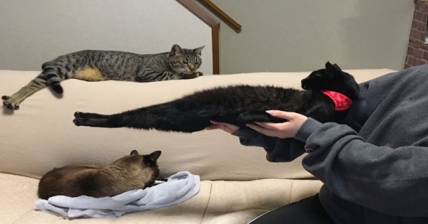 圖一PO出有許多網友紛紛表示:「這是傳說中的貓咪步槍!」、「好奇特的伸展方式」、「牠的身體裡面有鋼樑嗎?怎麼那麼直?」、「這黑貓參加鞍馬比賽一定得第一,姿勢一百!」、「黑貓表示:我正在做腹肌訓練,你們不懂啦!」,看來貓咪不只有軟Q當液體,連當直線也完全沒問題呢!
