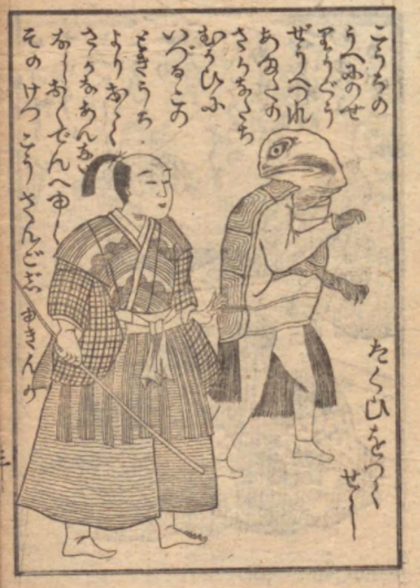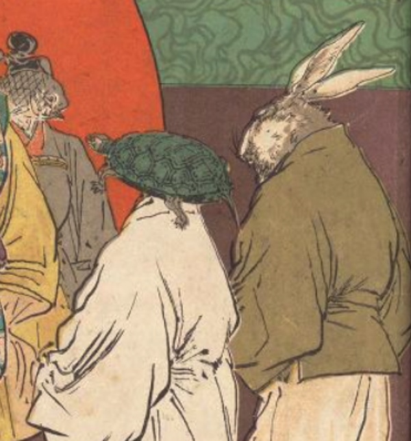 明治時期左右,像這樣的擬人化方式很常見。姑且不說兔子,難道那個烏龜就沒有其他的表現方式?(圖/Twitter@katsunomisanzai)