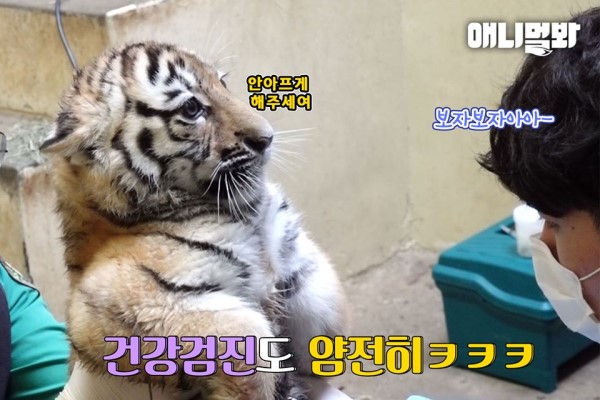 兩隻小虎寶寶雖然同為手足,不過個性卻有些不同,在工作人員抱起女孩Mugung聽診時,雖然牠有一點緊張,不過在打針時卻氣噴噴地對著醫生們哈氣,而另一隻男孩Taebeom則是從被抱起時就縮起手腳,完全僵硬不敢動好像在說:「人家不想要打針,好可怕喔!」模樣非常呆萌!