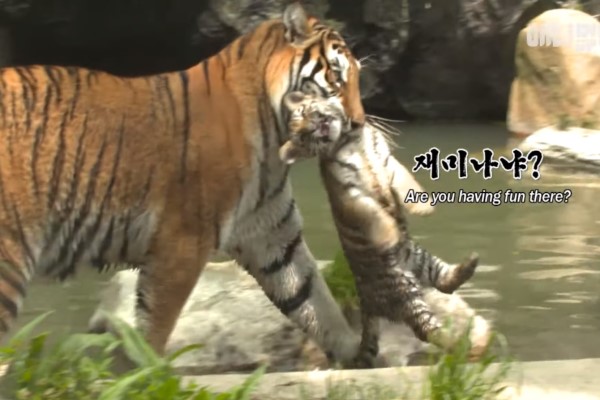 做足準備之後,小老虎們終於能與馬麻一起到戶外玩,只是調皮的Mugung不停跳進水裡,讓馬麻Geongon忙碌地將牠叼回岸上(圖/翻攝自YT@SBS TV동물농장x애니멀봐)