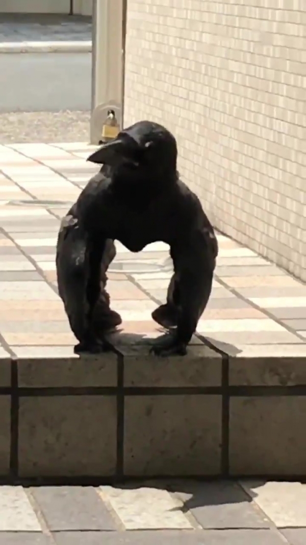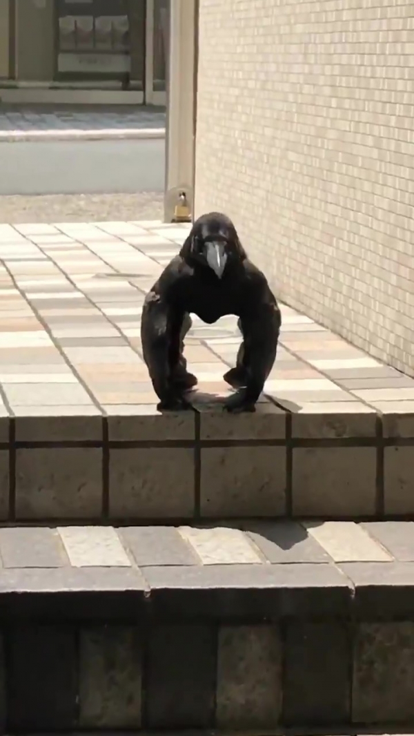 網友@keita_simpson這天在路過百貨公司時,驚見外頭的台階上站著這隻明明是烏鴉,卻有著「金剛身材」,嚇得他立馬錄影存證,證明自己不是眼花,並在貼文中說道:「真是謝謝你一早的驚嚇,對心臟很不好」畫面中看到烏鴉站立在地面上,身體的部分卻像大金剛一般「雙拳著地」,彷彿是甚麼突變的生物正在變身,影片曝光後也引起日本網友們熱議:到底看到的是什麼,進化版的烏鴉嗎?