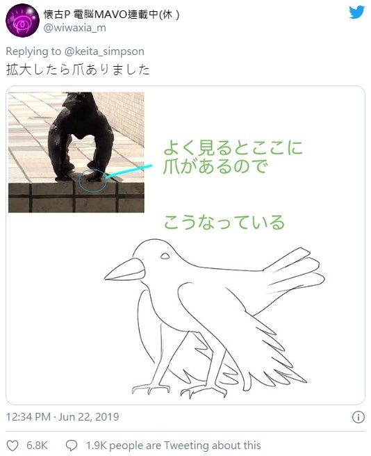 當然也有很冷靜的網友很認真地分析,判斷可能是因為烏鴉翅膀朝下,正好遮住了雙腳才呈現出這樣的錯視效果......