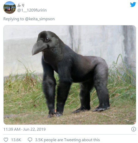 日本網友「@keita_simpson」在推特上po出,自己在名古屋某百貨公司外,看到一隻外型驚人的生物,只見明明頭部以上是烏鴉,但往下一看卻是宛如金剛的粗壯手臂,讓他當場看傻了眼,立刻拍下上傳,直呼:「一大早心臟就受到一大衝擊!」到底是甚麼奇怪的生物啊?