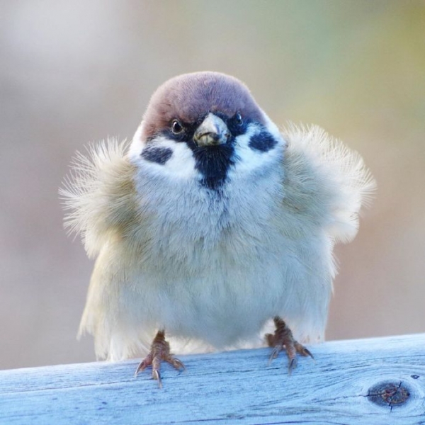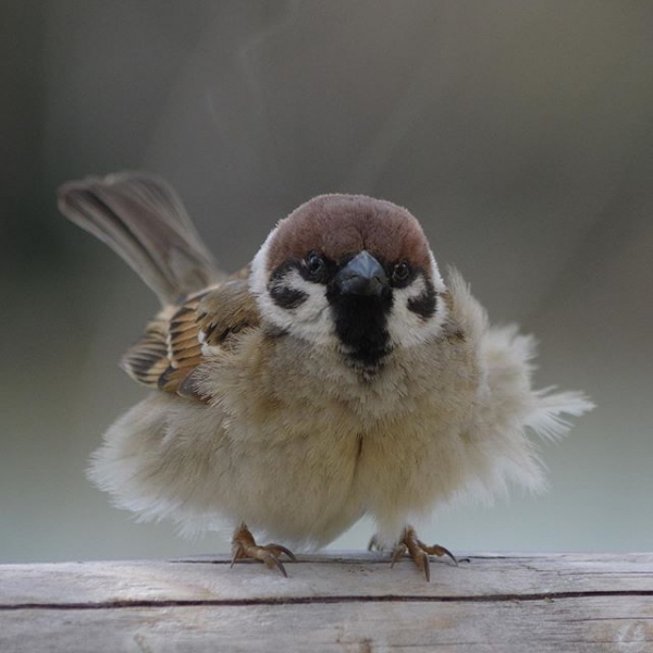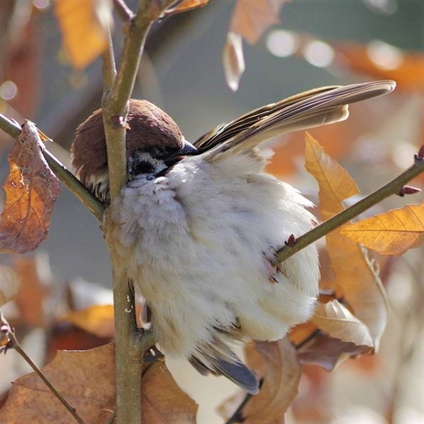 季節變化天氣變冷的時候,麻雀肚子周圍還會長出一圈蓬鬆的羽毛~圓滾滾的又更呆萌了,看起來像穿了一件貂皮大衣,整個氣場非常有氣勢!