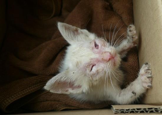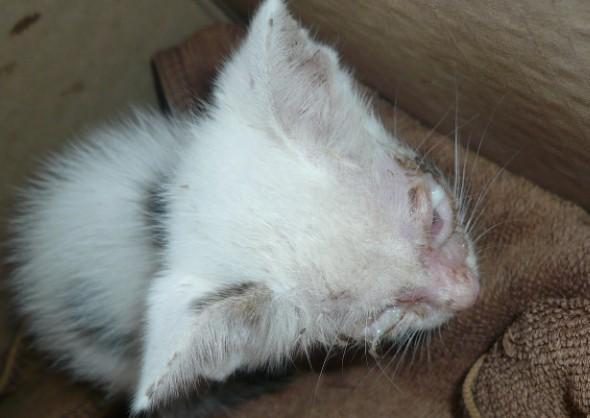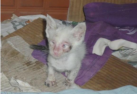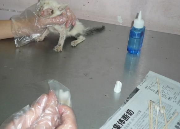 醫生正在給它擦洗治療,滴眼藥水。兩個眼睛炎症非常厲害,擠出了很多膿。