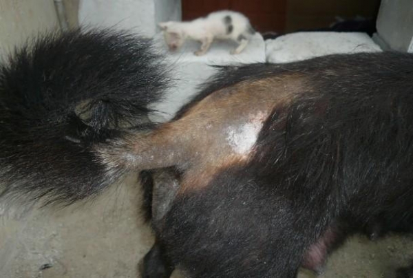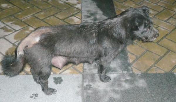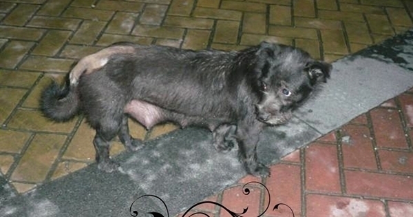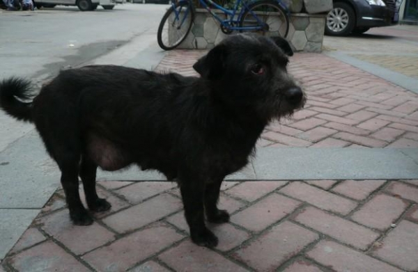 前幾天網友在無意路過一個商場的後面,發現一隻奶..頭腫脹的黑色狗狗在翻垃圾,慢慢的走近一看,發現她一隻眼睛很紅,屁股上的毛也掉光了,應該是得了什麼皮膚病,看著挺可憐的。