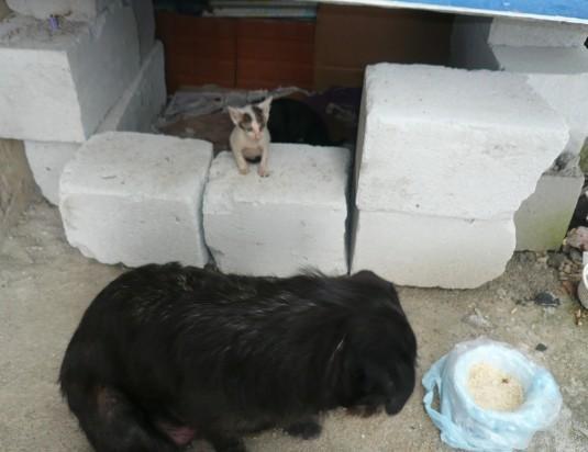 看著流浪狗媽媽本身生存困難,還帶著兩隻貓寶寶,一隻狗寶寶苦苦的堅持著,忍不住淚流……