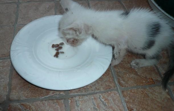 家裡沒有奶粉給它喝,嘗試著讓它吃幾顆貓糧。