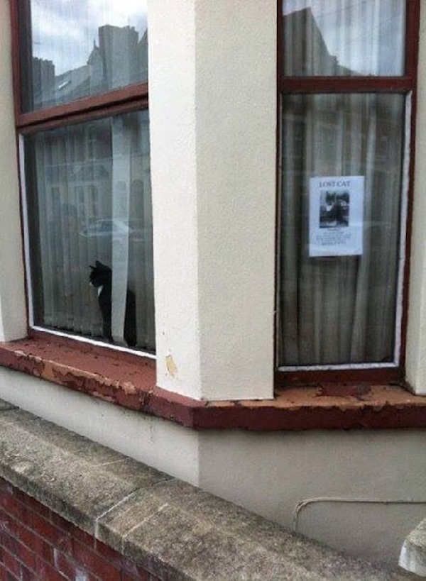 ▼Reddit帳號Kodibramble分享了一張照片,這位超冒失的主人在自家窗戶門口貼了尋貓啟事,但是......牠根本就在家阿!!!!