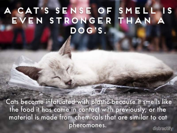 4. 貓咪的嗅覺比狗狗還要敏銳,喜歡塑膠袋的牠們、可能是因為裡面有裝過好吃的食物、或是其中的化學成分跟貓咪荷爾蒙很類似~
