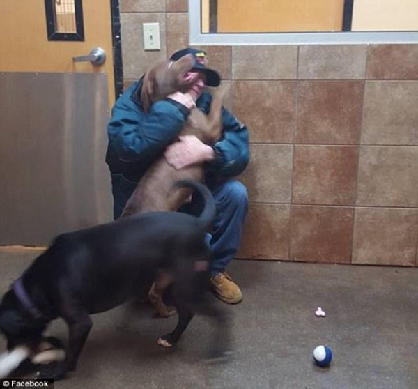 當寵物店工作人員打開籠子後,一條狗狗看到主人飛奔過來。